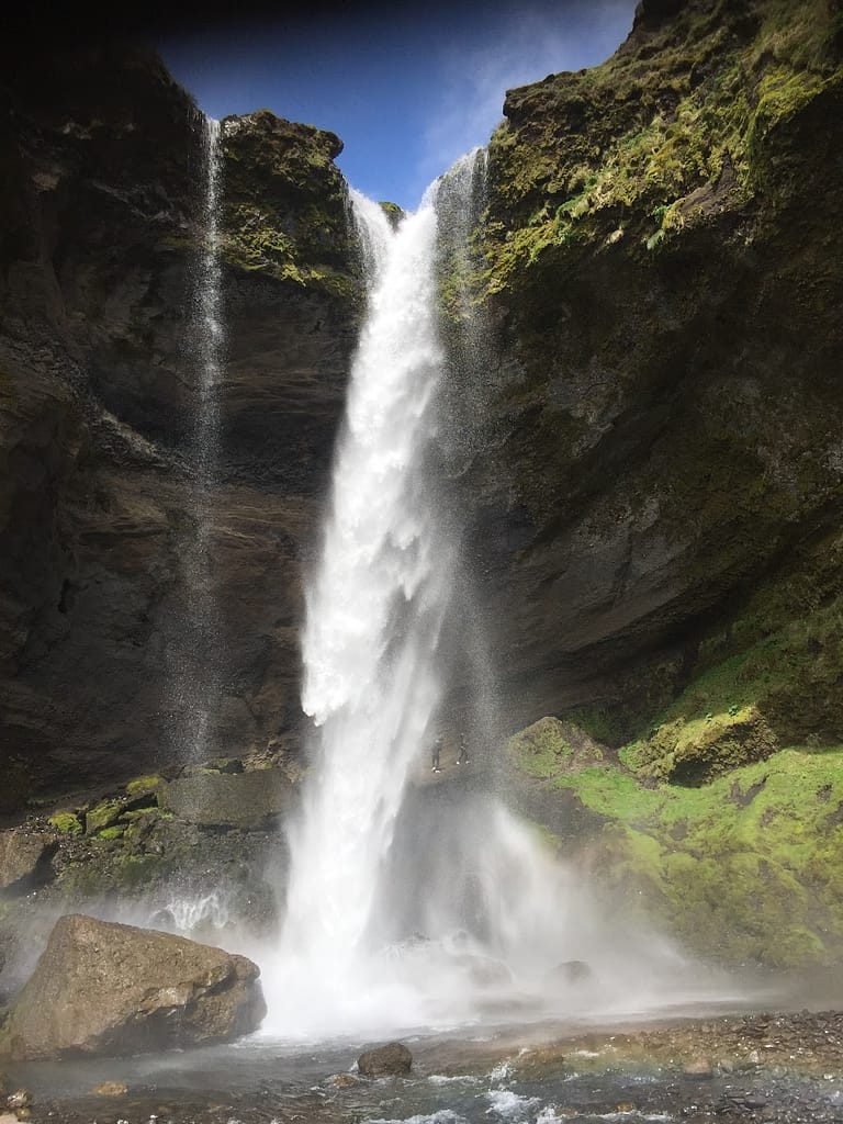Vi besöker det vackra vattenfallet Seljalandsfoss, där vi kan gå bakom vattenfallet.
