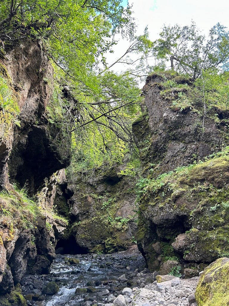 På vägen tillbaka stannar vi till och går in i en smal ravin vid Stakkholtsgjá, en magnifik och hisnande ravin.
